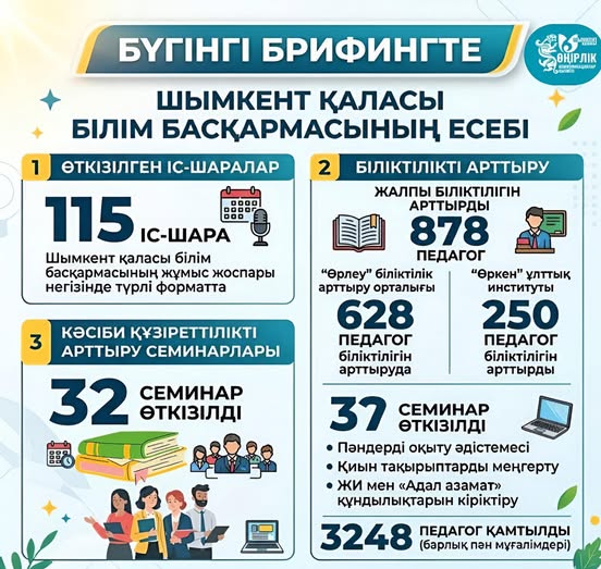 Шымкент қаласы білім басқармасының жұмыс жоспарына сәйкес, білім беру саласында түрлі форматта жалпы 115 іс-шара өткізілді.